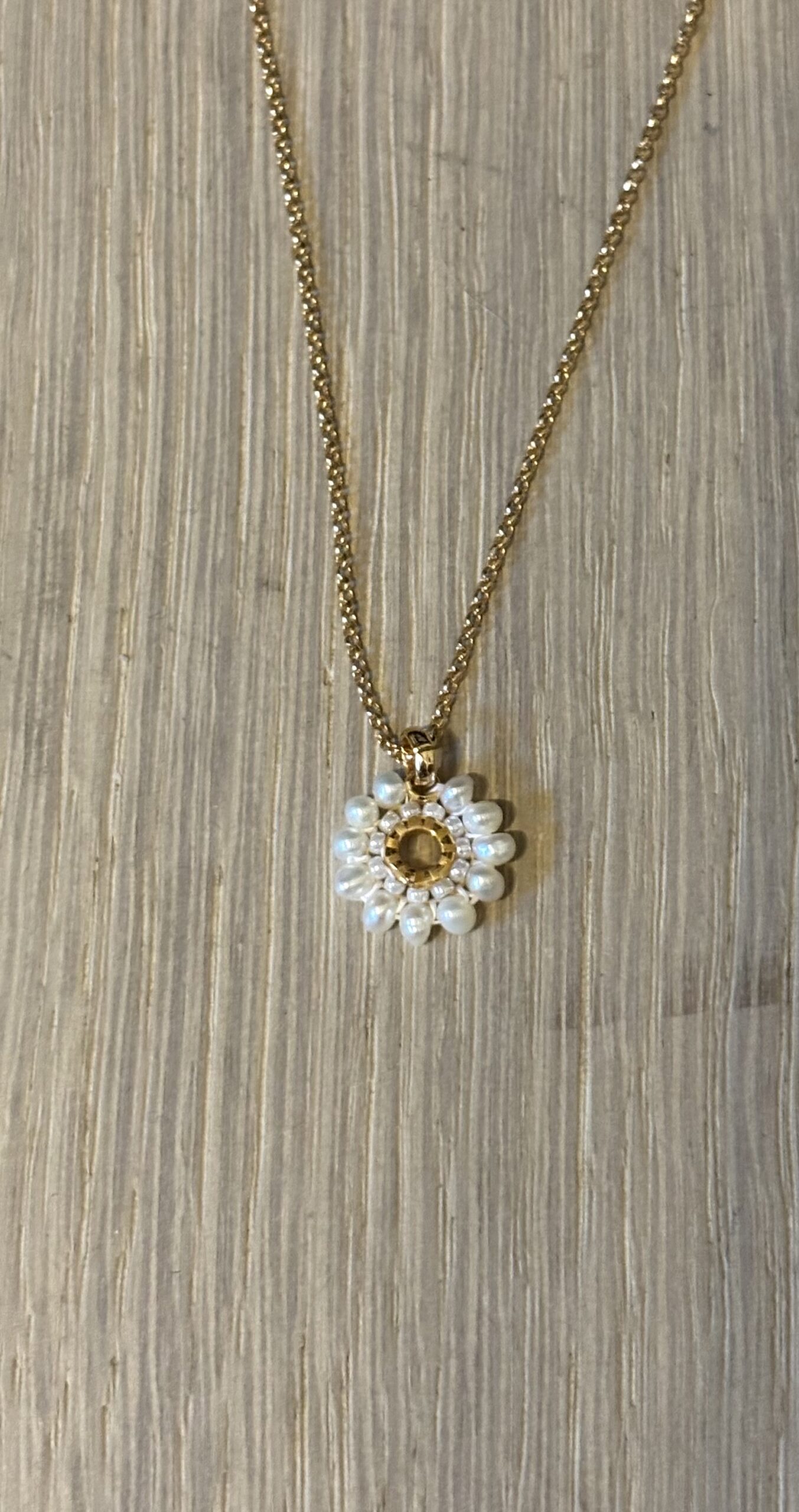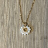 Fein gearbeitete Glasperlen umrahmen den sanft schimmernden Stein in der Mitte und reflektieren das Licht mit jedem deiner Bewegungen.